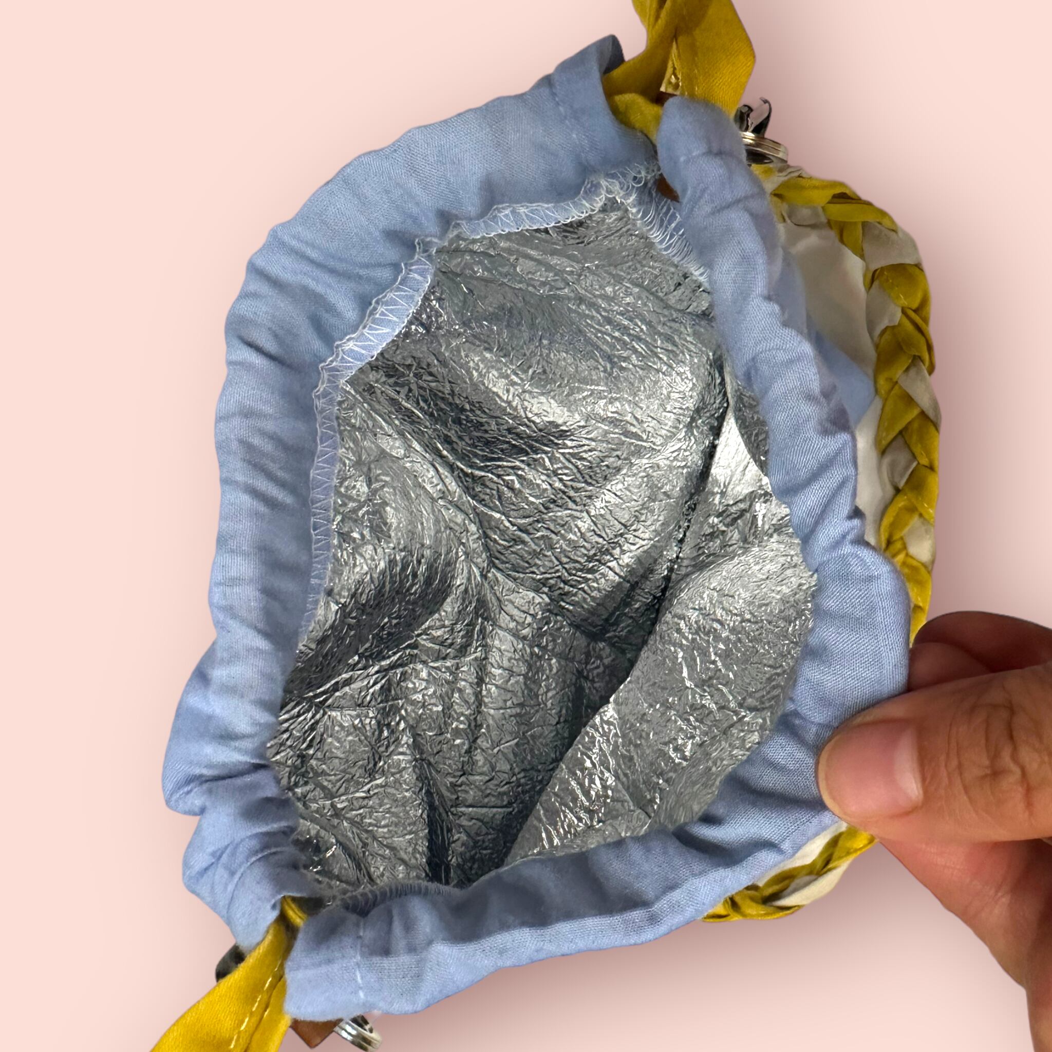 高温でアイロンしてしまうと、中の銀色の部分が溶けてしまうので、注文で低温から様子を見ながら、水色の布の方から当て布して実施してください。